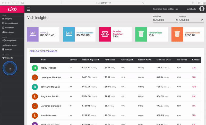 - Gaspillage Estimé parce que nous comprenons que toutes les formules ne sont pas repesées, Vish estime la quantité de produit réellement gaspillée basée sur le gaspillage mesuré réel et le pourcentage de repeser